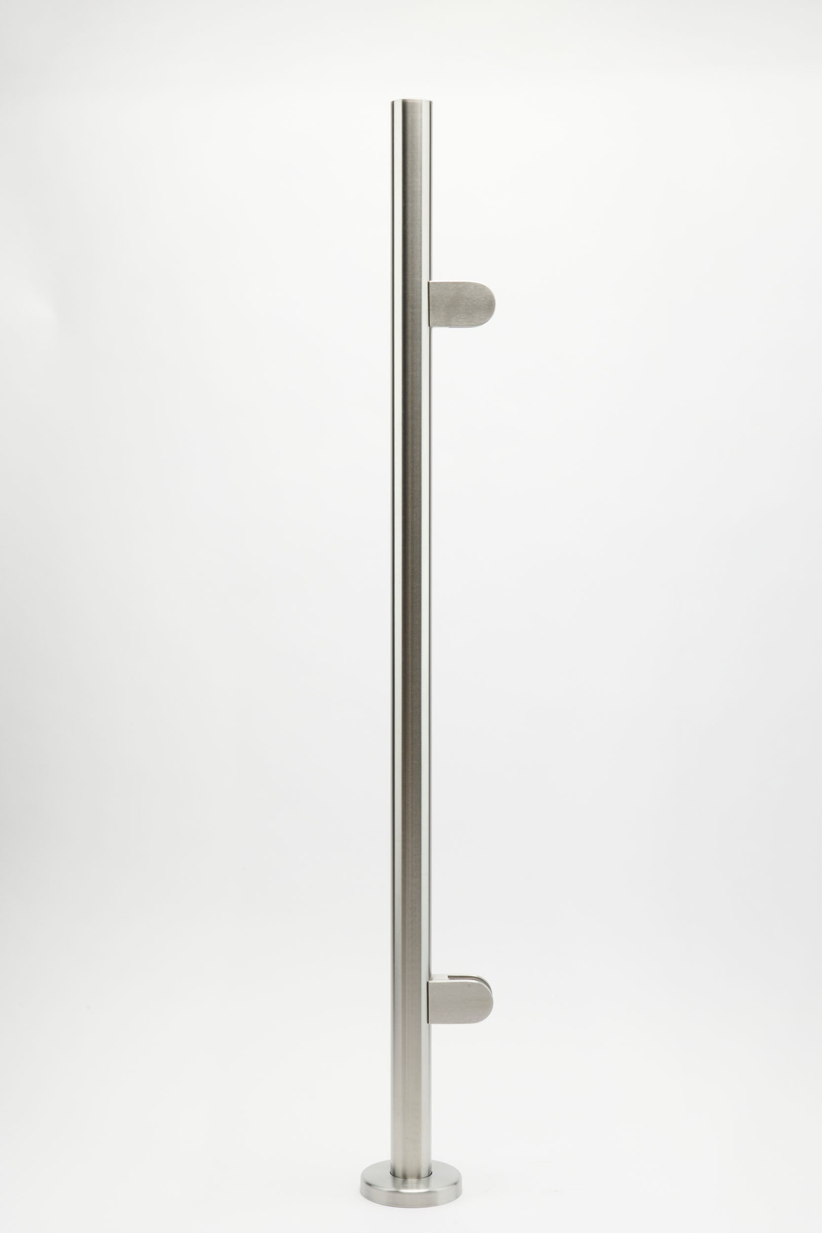 \nFeaturing a brushed satin finish and standing at 1100mm tall, these 48mm handrail corner posts come with matching base plate and cover, 4 x 10mm middle glass clamps (complete with rubber covers), and an end cap.
